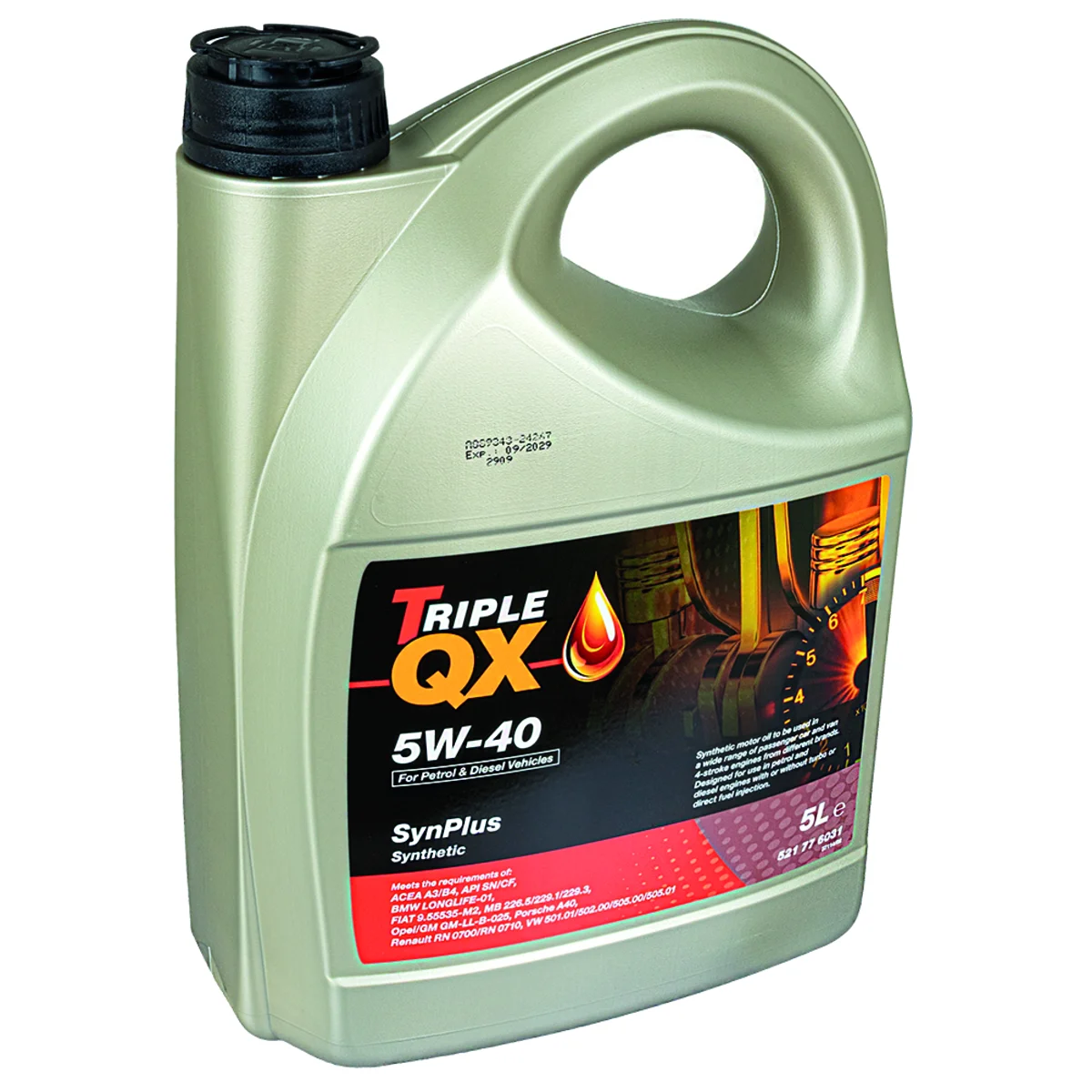Motorolja TripleQX 5W-40, 5L Full synthetic Motor Oil. Viscosity 5W-40. 5L Bottle, 4.29kg. Type: Synthetic; Viscosity: 5W40; Full Synthetic Oil; Oil Viscosity Classification SAE: 5W40. Manufacturer, Specification: ACEA: A3/B4-12 API: SN/CF BMW: LONGLIFE-01 MB: 226.5 MB: 229.3 OPEL: GM-LL-B-025 PORSCHE: A40 PSA: B71 2296 RENAULT: RN 0700 RENAULT: RN 0710 VW: Approval 502.00 VW: Approval 505.00. APPLICATIONS: This oil is used in gasoline engines of cars, which meet the highest performance, and diesel engines of passenger cars with turbo and direct fuel injection. The high quality allows extended drain intervals, according to the specific requirements of manufacturers. For 1L Bottle = 79-800-5018, 20L Bottle = 79-800-5200